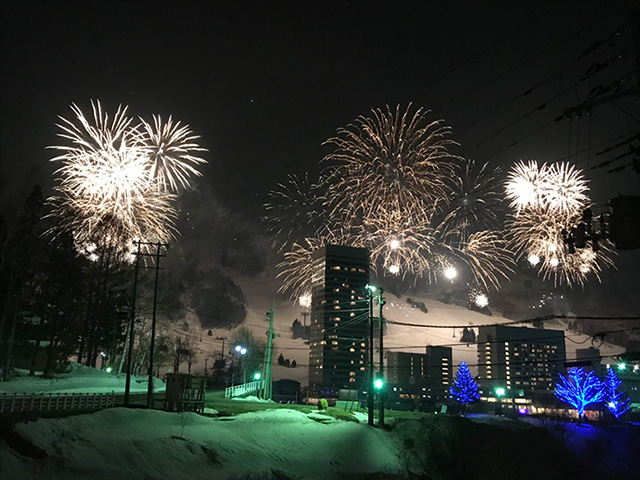 苗場の夜のお楽しみの一つに豪華な花火があります。白銀のゲレンデは華やかなファンタジーワールドに包まれてロマンチックな世界を作り出します。